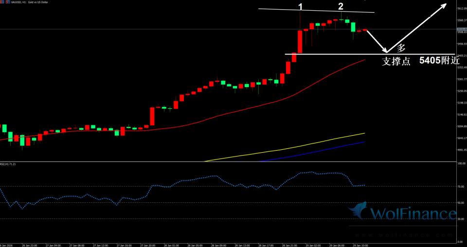 周四(01月29日)欧盘时段黄金价格震荡价格回落,市场多单平仓获利回吐,预期回落下方红色支撑点附近。可以考虑多单入场观点,今日国际黄金价格延续强势上行走势,XAU/USD上涨逾3%,逼近5600美元一线,再度刷新历史高位。自本周初以来,金价累计涨幅已超过10%,呈现出明显的加速拉升特征,显示市场避险情绪正快速升温。 推动黄金大幅上涨的核心因素,来自地缘政治与宏观经济不确定性的集中爆发。欧洲方面,作为欧元区最大经济体的德国下调了今年及明年的经济增长预期,引发市场对全球经济前景的再度担忧。与此同时,美国去年实施的关税政策对全球贸易与经济活动的拖累效应重新进入市场视野,加剧了风险资产的波动。地缘局势同样持续恶化。美国总统特朗普警告伊朗,要求其就核问题重返谈判桌,否则未来的军事打击将“更加严厉”。伊朗方面则以可能打击美国及其盟友作为回应,令中东紧张局势明显升温。