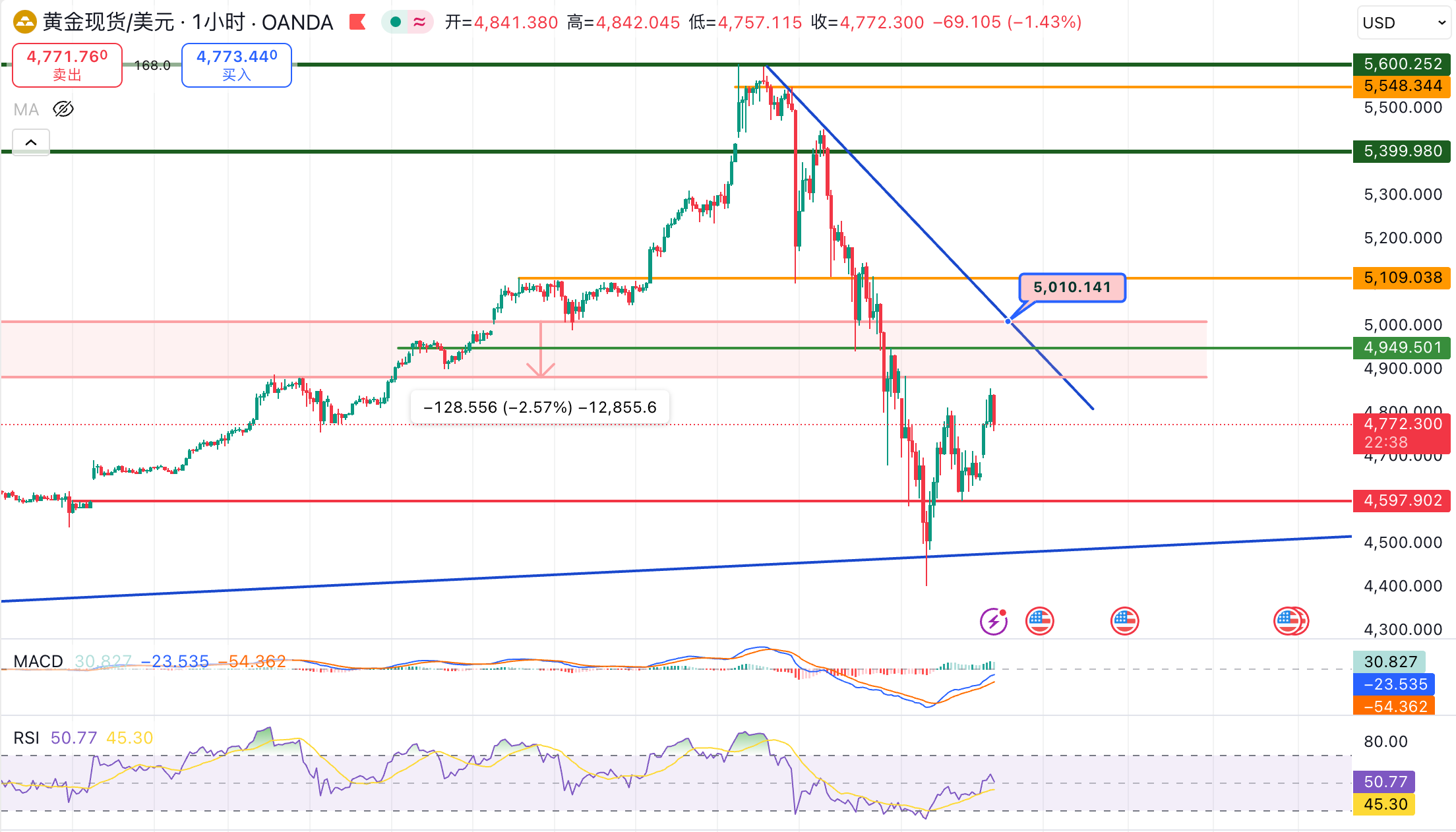 如果金价再次跌回此前的趋势线下方,结构性风险依然存在,不排除价格回探 4400 美元,甚至更低。区别只在于:当前市场已经从“单边踩踏”,进入到多空重新博弈、结构重建的阶段。