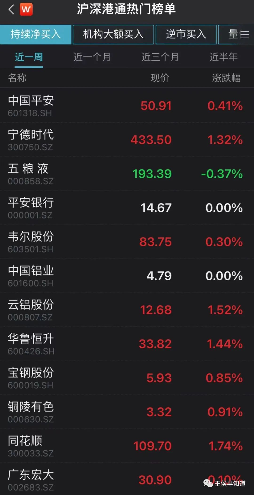 解析:下图为北向资金近一周持续净买入排名靠前的公司,可以发现北向资金主要加仓了新能源、金融以及有色金属板块相关公司,短期新能源反弹已经过半,因此建议关注金融和有色相关公司。比如:中国平安、云铝股份、同花顺等。