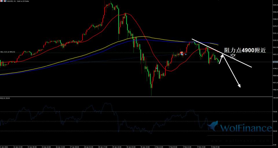 周四(2月5日),美盘初金价三均线阻力点附近震荡盘整市场关注阻力点空单逻辑,黄金并未延续此前的强势反弹。现货黄金目前在4790美元附近区间震荡,盘中下挫超过2%,再次验证了5000美元上方的压力并非短期噪音,该关口已成为当前行情的关键阻力。基本面层面,黄金当前面对的是整体顺风条件的消退,高利率预期抬头、美元维持强势,推高黄金持有成本,使得资金配置更趋谨慎。尽管央行购金和亚洲实物需求仍在,但这类力量仅起到“缓冲器”作用,无法推动价格加速上行;加之此前涨幅过大、投机仓位尚未完全冷却,市场更倾向于将反弹视为技术性修复,而非新一轮行情的开端,基本面并未打开新的上涨想象空间,仅延缓了下行节奏。