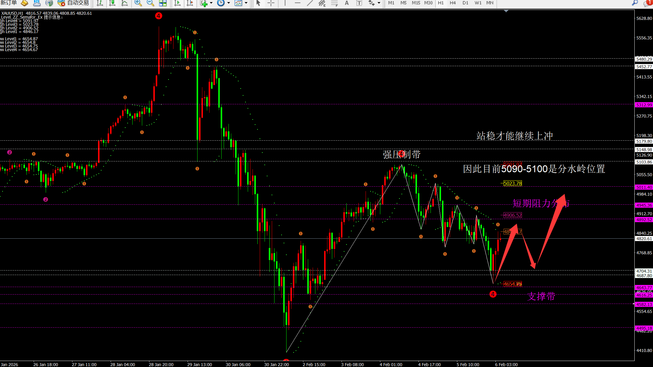 昨日单边下跌260美金。从昨日走势看:,上方阻力是4885-4950以及5020一线。