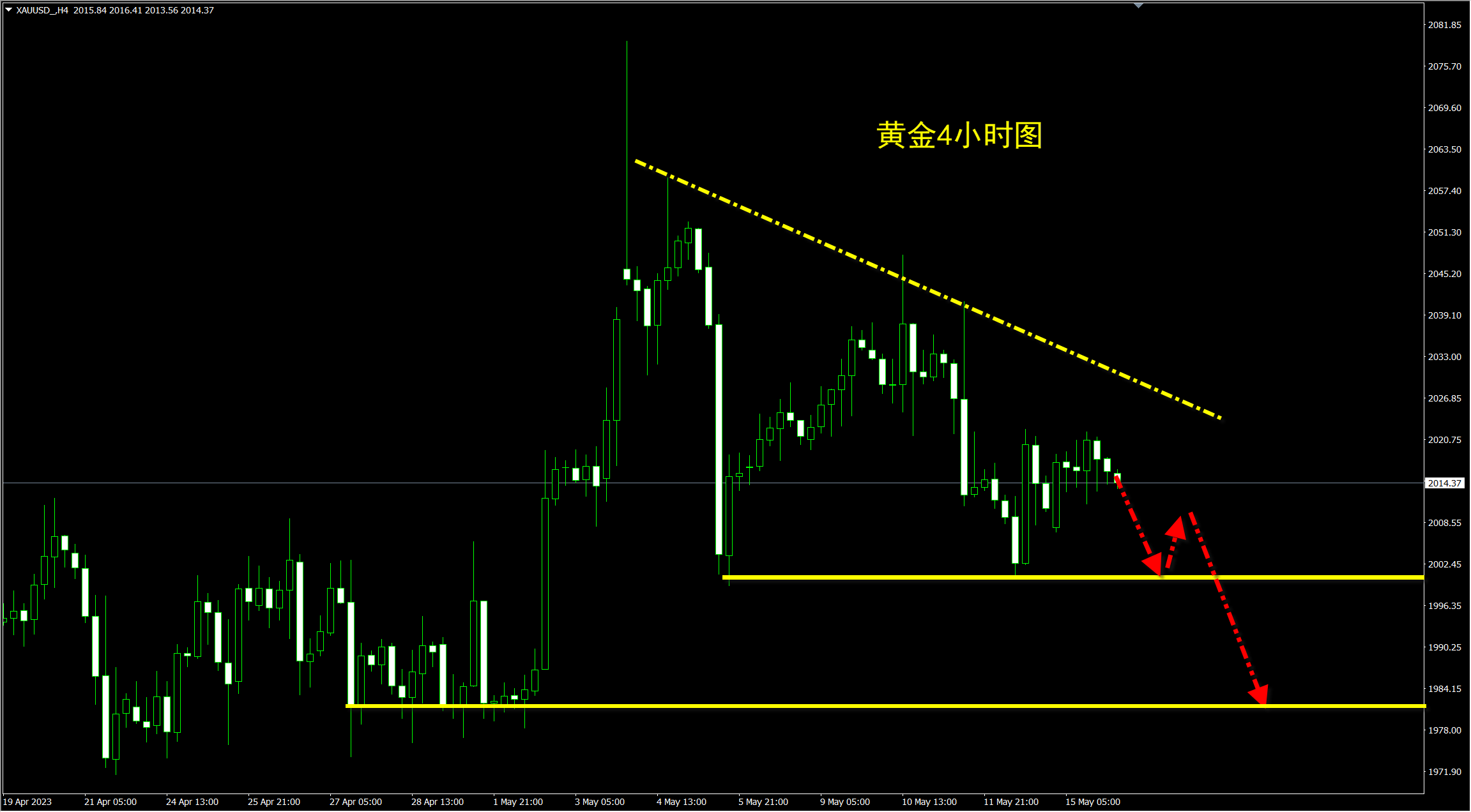 黄金昨日窄幅震荡,没有真正突破2020的压力位置,依旧是偏空的行情,今日依托2020的压力继续做空看跌! 从4小时走势上看,黄金处于下跌过程中,震荡下跌,反弹高点再不断降低!现在正好是反弹至压力位置,再次做