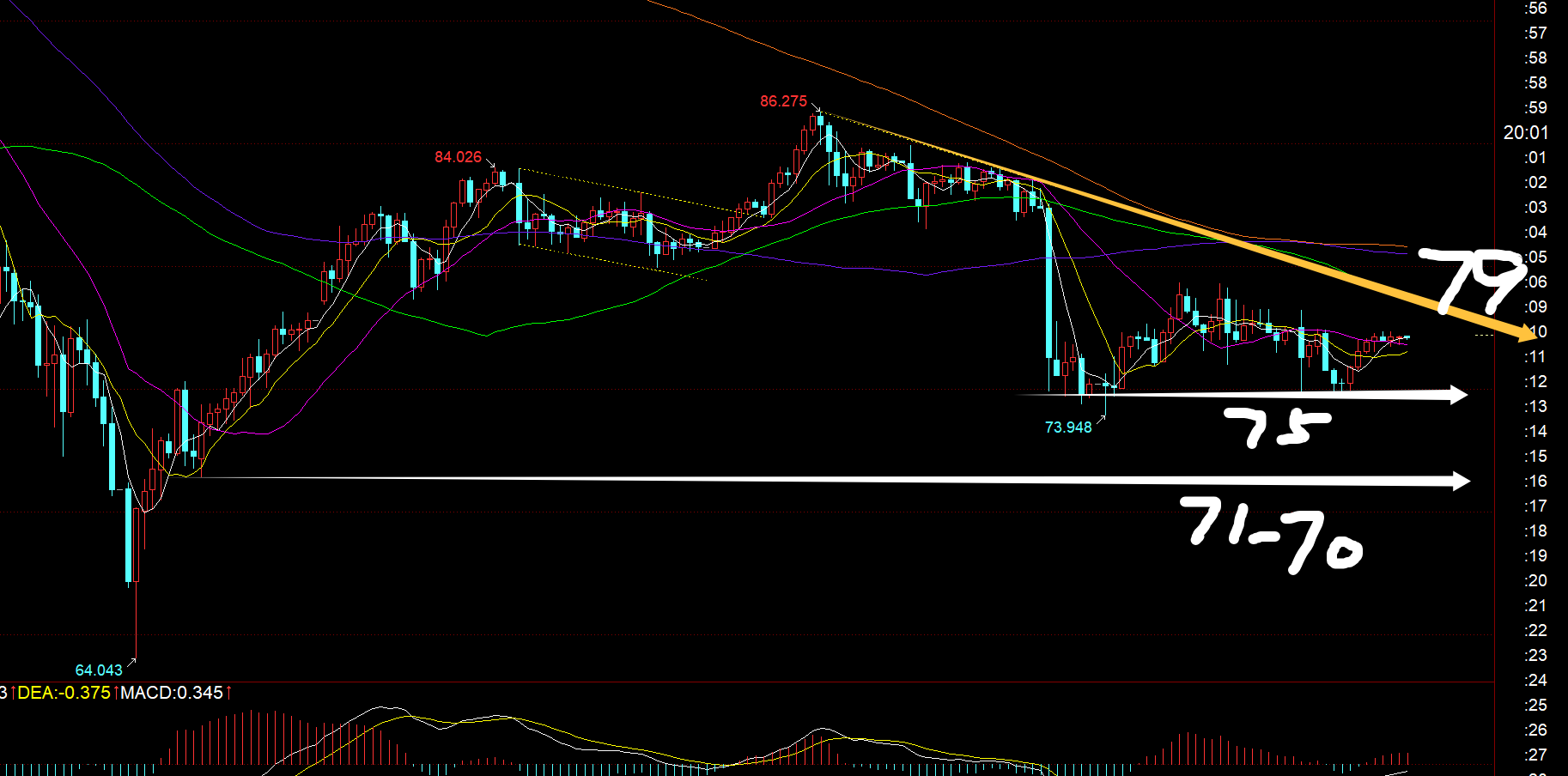 第二,白银方面:关键阻力继续留意黄色趋势压力线,当前下移79,只有突破站上此线,才有希望进一步的加大反弹力度,再去试探86; 反之,压制79下,下方留意支撑75,71-70,围绕支撑和阻力之间也要震荡些时间;