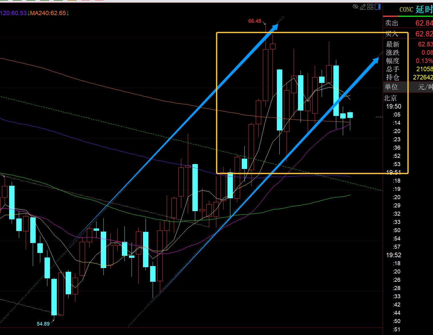 第三,原油方面:上行通道是失守了,目前短期5日、10日成为阻力63.6左右,支撑暂时是中轨62.6,而整体还处于高位黄色框内上下整理,大概66-60这个范围;所以,它应该是在酝酿新的通道,这两天波动也不大,可静静观察;