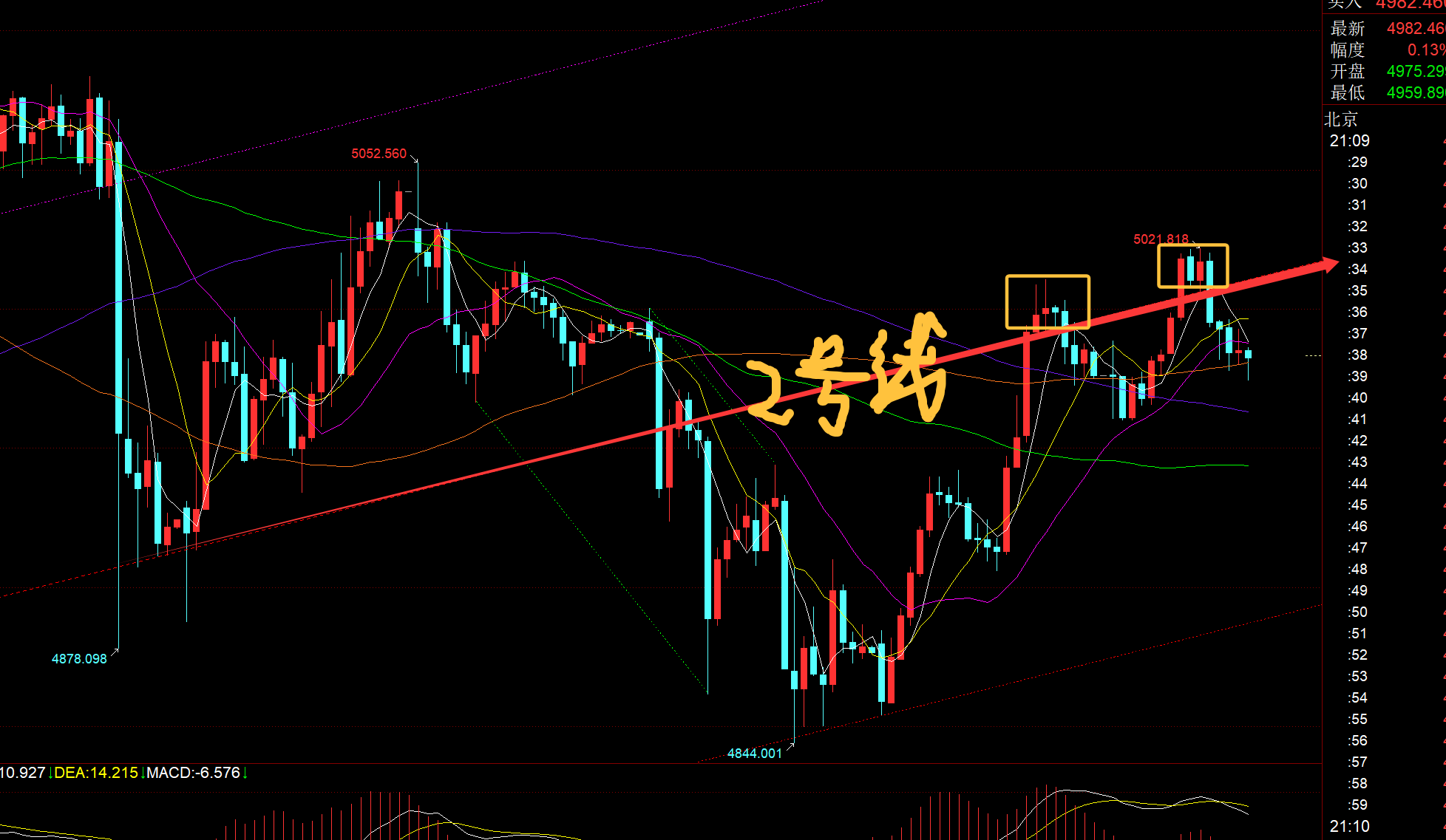 第二,黄金小时线级别:今日亚盘早间和昨日类似,仍是直接出现连阳上攻,依托中轨发力,日内借助小级别顶底支撑4969、4976、5006陆续北上,最高触及5022,全部成功;欧盘期间,它已有所突破图中红色通道2号线阻力,但还是和昨夜那样,只是短暂停留2个小时后再次打压回落于压力线之下,那么又要展开反复的震荡整理;今晚关注红色2号线反压点5011左右,下方支撑4960今日低点上,区间内要整理下; 然后留意中轨,突破站上它,再回踩企稳则有机会再冲击5000上方;另外,若向下失守4960日内低点,那么就要走宽幅来回过山车行情了,那样可能又会见到4900-4910;做好一切的可能,才能坦然接受,总之就是仍还要持续震荡来对待;