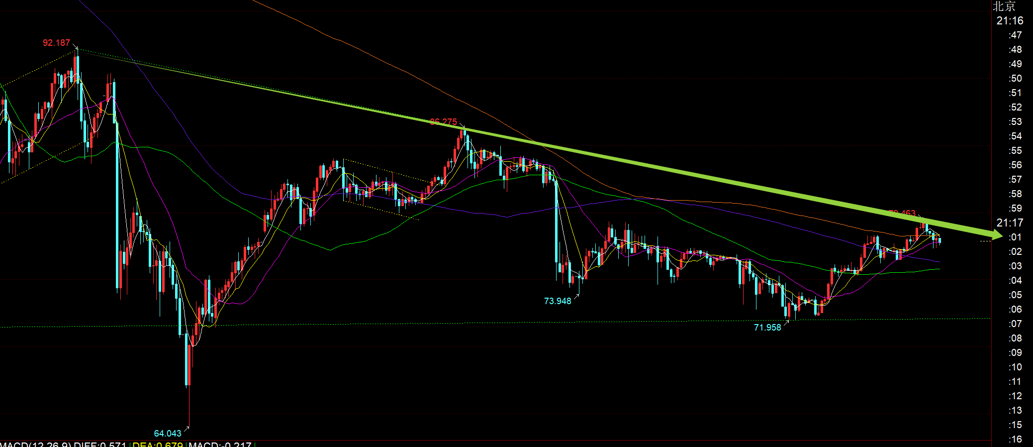 白银方面:这两日震荡式拉升,今日触及了关键趋势阻力线79-80,但欧盘期间也并未直接突破站上,有所打压回落,也存在继续震荡底部磨的概率;慢慢等时间,什么时候突破站上此线,就有动能进一步的拉高去试探86、92前面的几个高点;当前支撑留意76-75,72及下属于偏强支撑;