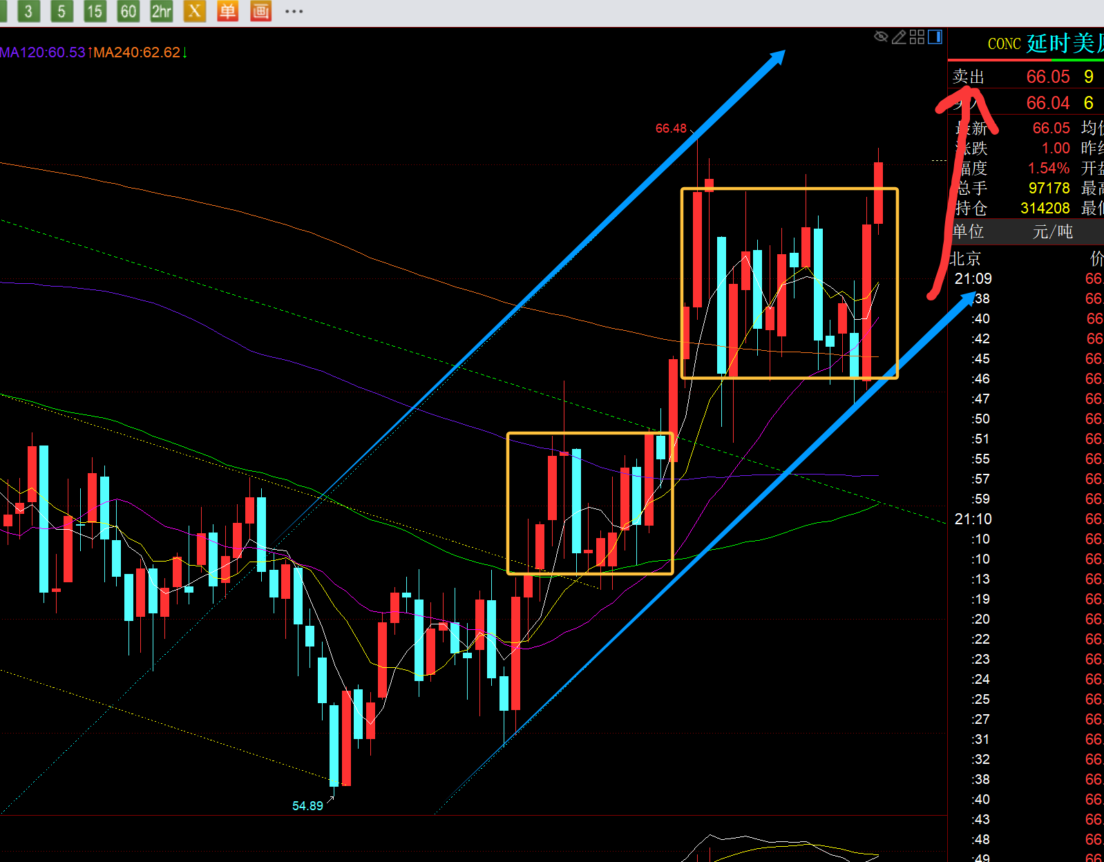 原油方面:如图,出现新的上行通道,当前还处于66-62高位横盘区间,回踩留意通道下轨,支撑会逐步上移64-63,等下来确认再继续震荡北上;