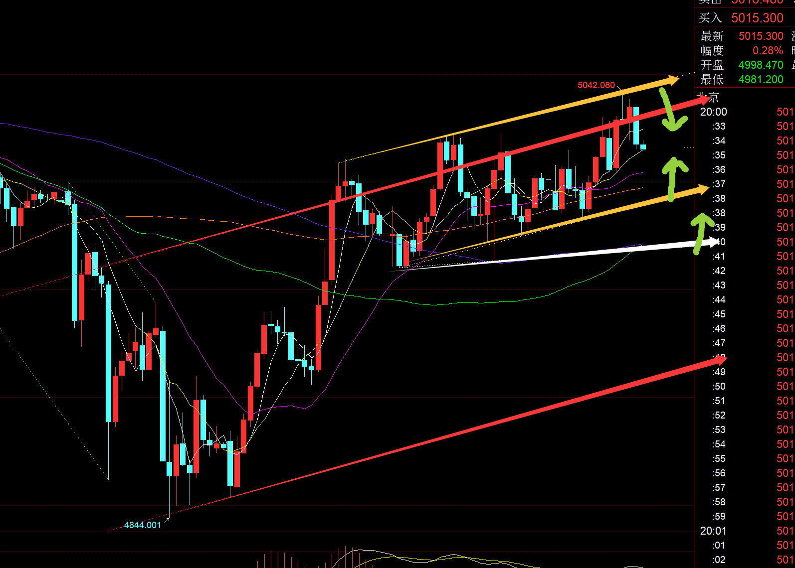 第二,黄金小时线级别:今日的震荡节奏时间点基本和昨日类似,早间亚盘下探后企稳拉升,欧盘有所冲高回落,美盘继续看震荡;今日没有明显的618分割法则运用,但是通道法则的运行还是可以的;从上图可以看出,阻力位是两个,一个是红色通道2号线(欧盘16点已成功压制一波),这几日一直围绕它展开,但每次都只是击穿,并未有效持续站稳,另一个是黄色通道上轨5040-45(当前成功压制),关键支撑也有两个,一个是黄色通道下轨,大概上移4990,另一个是白色趋势线支撑4968,在没有短期明显较强的趋势之前,继续以震荡来展开,卡两边尝试;另外,若出现突袭的稍大力度的打压,那么就是把握低位炒底的时机;