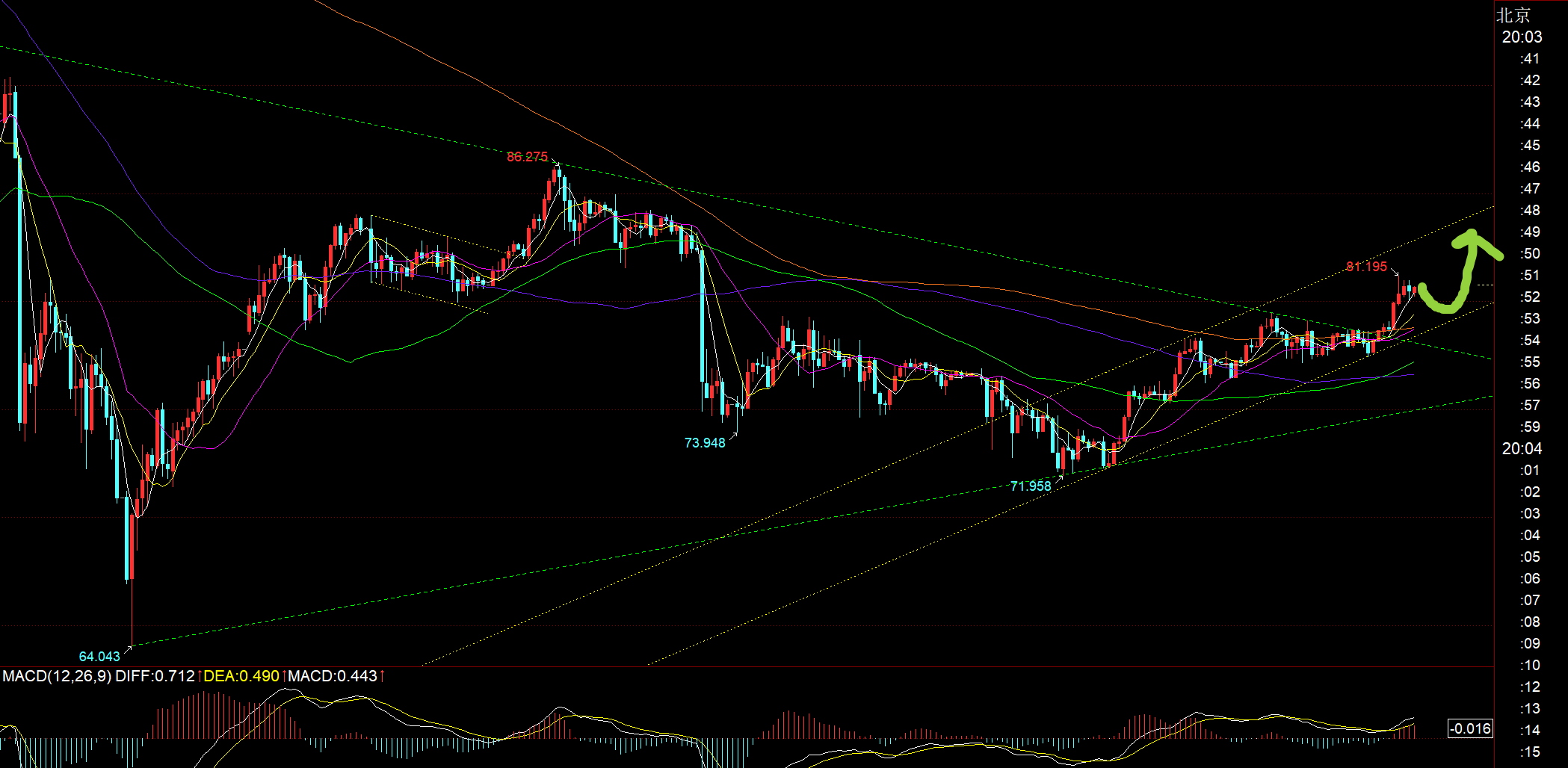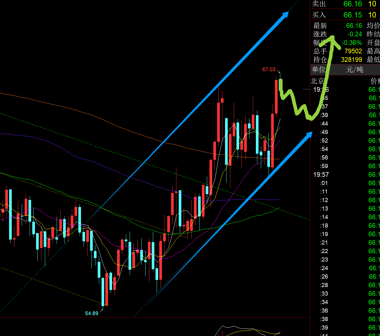 原油方面:从日线形态和通道来看,想要不错的继续北上机会,就要耐心等尽量靠近蓝色通道下轨,大概还需等待几日时间,支撑64及下方择机继续北上,通过一波连阳拉升+持续横盘+连阳拉升的走法来演绎,逐步走高;