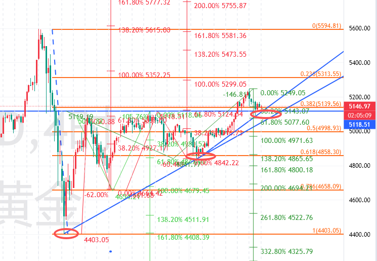 今天5190区域压制先看调整,下方5100-5090重点看反弹;也就是先看区间,上破走强下破走弱。上破则看冲击5240-50区域压制再回落,继续突破则关注冲击5300及5350-60区域回落;下破5100-5090则看回落5050-40以及4990-5000美元区域支撑走反弹。