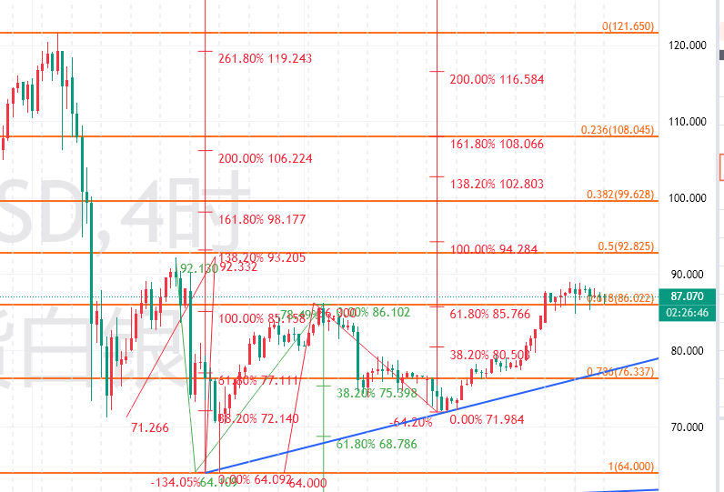 白银短期保持强势,整体其实属于弱势,上述已经讲过。今天短期的话,白银首先89-90压制看调整,然后92-93压制看调整;进一步重点阻力在96-97美元以及100-101美元,冲高压制看跌。下方85区域短期重点,然后79-80区域重点。