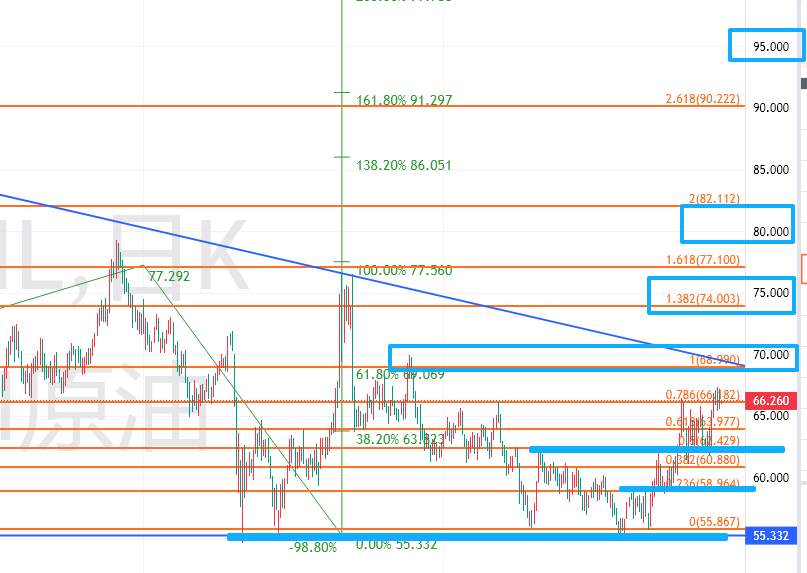 美原油,走势符合预期,看好今年大牛市。短期62-63美元支撑,回落依然低多;然后59-60美元和55-54美元支撑低多。短期阻力68-69,当前遇阻看回落后再涨,进一步中期目标75-80美元,长期95-100美元。