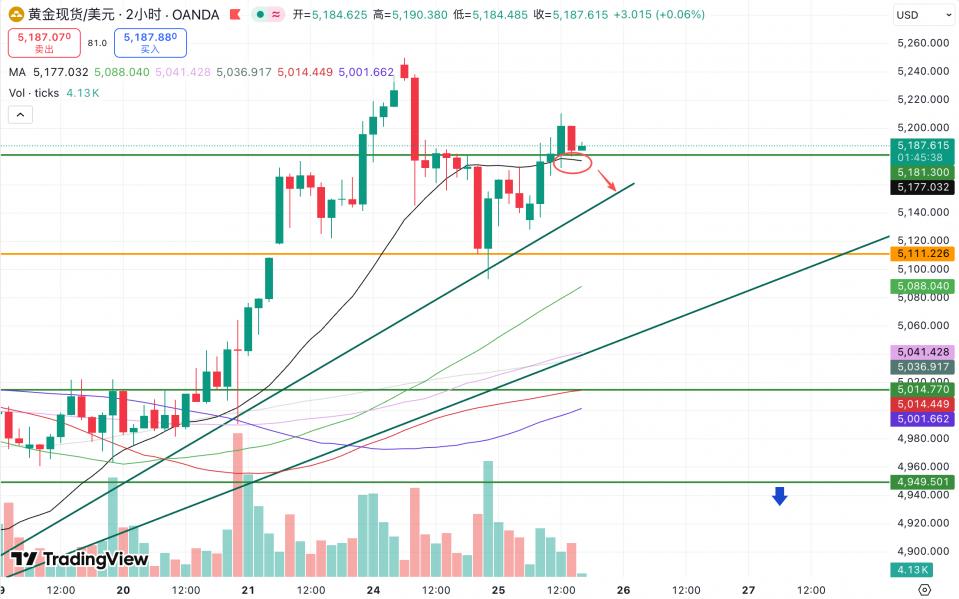 今天下午欧盘初段,现货黄金价格正处于高位震荡修复阶段。当前价格约5180–5190 附近区间小幅波动)。