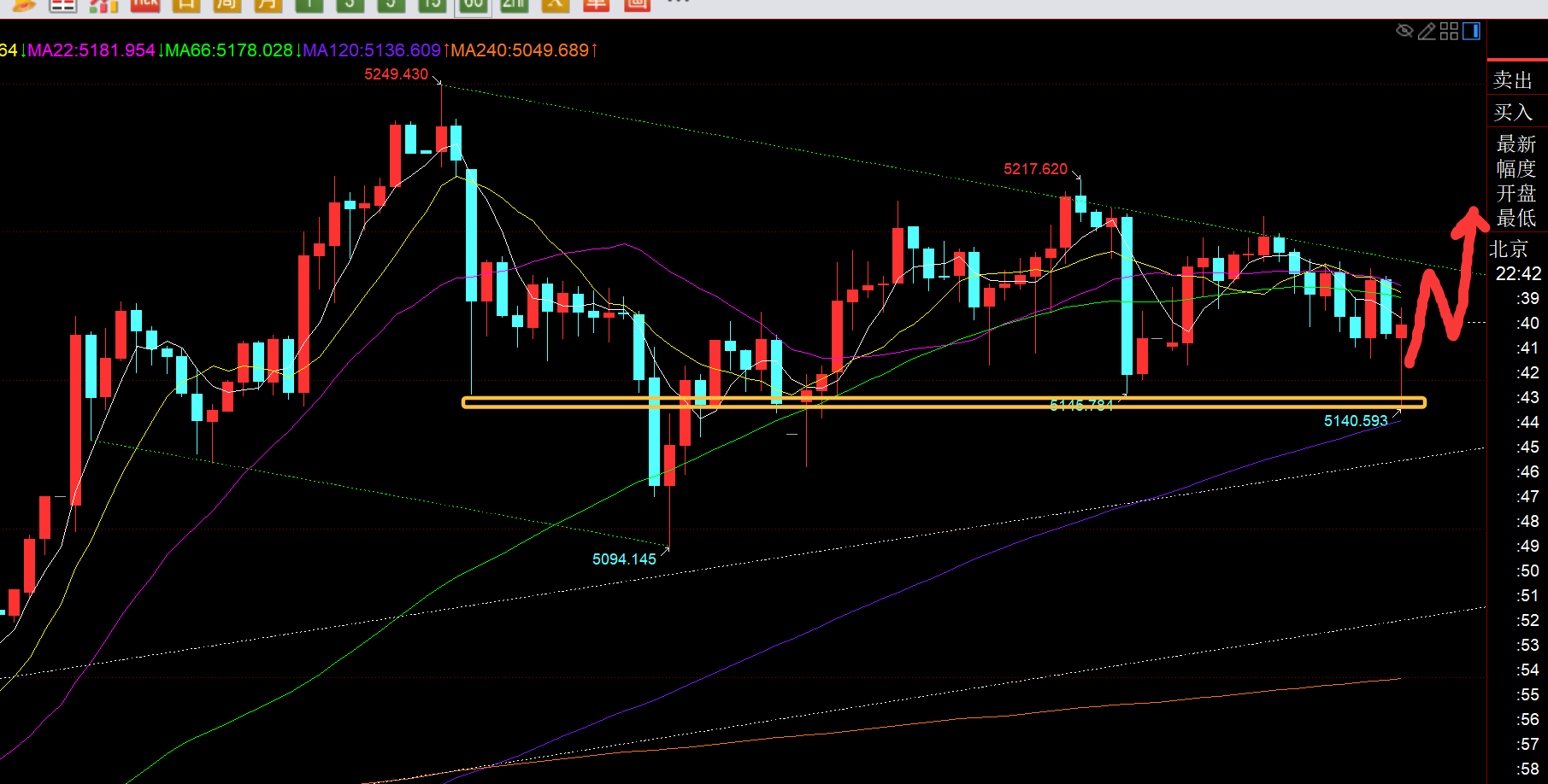第二,黄金小时线级别:昨日收盘前大阴砸盘一波至5145,企稳于5090-5217的618分割支撑5140上,今日早间下探企稳5155出现大阳K拉升,基本陷入了震荡,日内最高反弹至5205,也就是大阴K高点,但并未站稳5200;欧盘围绕5155起涨点,5200下阻力,反复震荡整理;在这过程中,依然卡618,也就是5170把握一次北上,反弹至5190,短线利润是有了;此时美盘仍在震荡,不管是短期上升旗形也好,还是五浪上涨也好,最终都会认为能冲击5300上方,既然它要慢慢磨,那就耐心等待,出现突然大幅急跌,那么急跌的低点都是相对不错的短期低位;刚才急跌打出的5140就是今晚关键了,618+顶底共振,不跌破此处,会处于此位置上方震荡运行,而只有突破站上5190,才能迎来一波不错的向上拉升,冲击5220、5250等;