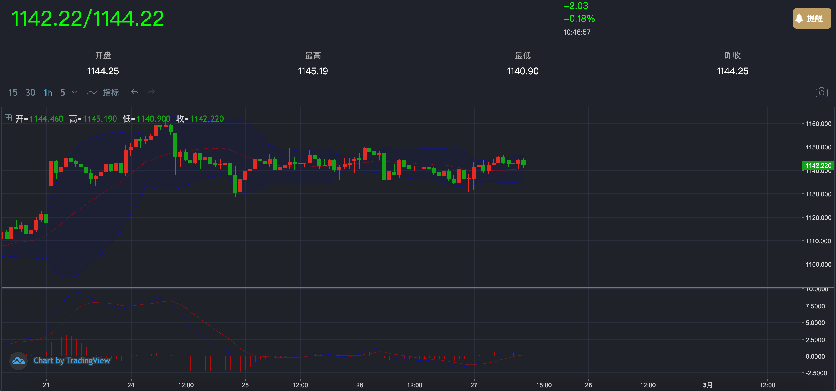 融通金价格在前期冲高至1145一线后未能延续上攻,随后进入高位横盘整理。目前报价约1142附近,整体呈现“高位震荡、动能收敛”的特征。