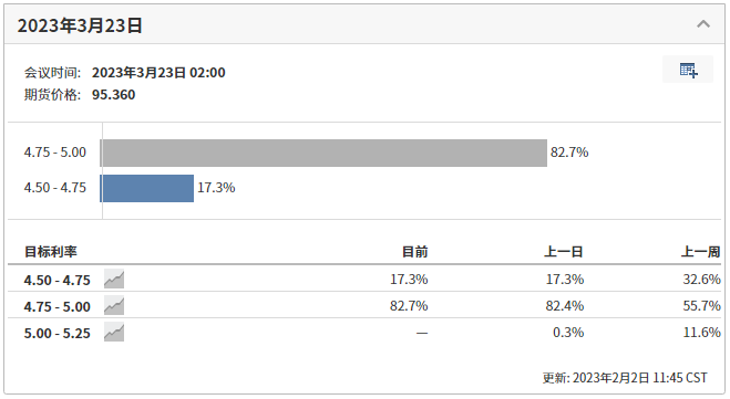 2 月 2 日凌晨 03:00,美联储宣布, FOMC 投票委员全票赞成,将政策利率联邦基金利率的目标区间从 4.25% 至 4.50% 上调到 4.50% 至 4.75%,加息 25 个基点。这也是美联储去年 3 月以来的连续第八次加息,总加息幅度累计高达 450 个基点,达到 2007 年 9 月以来的最高水平。