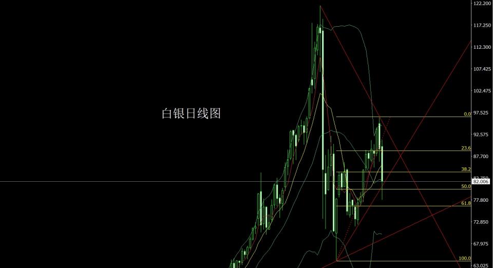 昨日黄金市场早盘开盘在5331的位置后行情直接拉升,日线最高触及到了5380.6的位置后行情强势回落,跌破5260的前日射击之星低点后行情强势下行,日线最低给到了4994.5的位置后尾盘拉升,日线最终收线在了5090.3的位置后,日线以一根下影线长于上影线的大阴线收线,而这样的形态收尾后,下方4400的多和4670的多减仓后止损跟进在4700,今日的行情早盘如果先回落5000多止损4994,目标看5110和5150和5200和5250-5300.