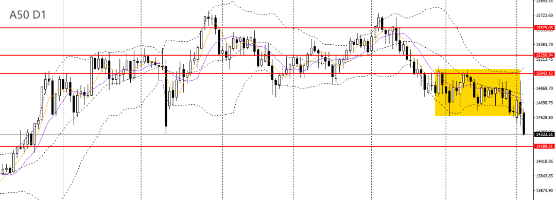 A50周二收长阴柱,今日亚盘延续下行,4小时彻底打破此前区间震荡格局,14500附近承压可进空,短线大概率将回踩14000关口附近。