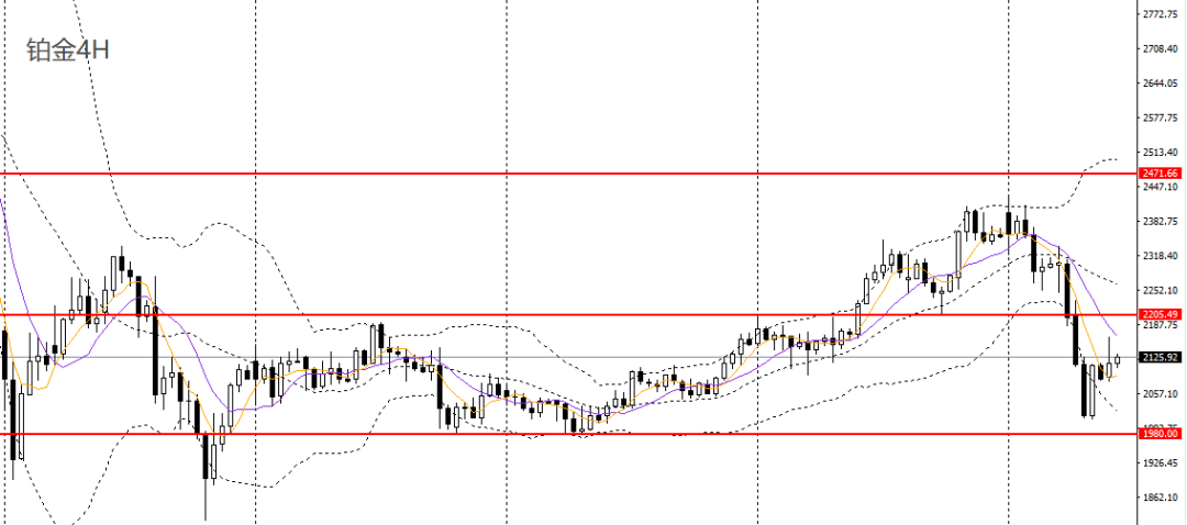 铂金再收长阴柱,日线RSI跌破50,4小时呈平头底部,空单可考虑减仓,如于2200附近承压可进空。