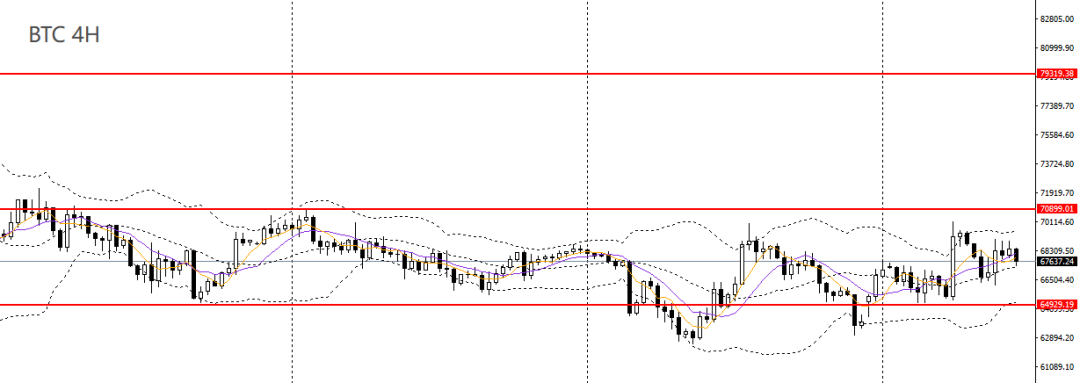 比特币昨日收锤子阴线,始终徘徊于5日、10日均线附近,4小时多次于70000关口附近遇阻,短线预计将延续震荡格局,可保持观望。