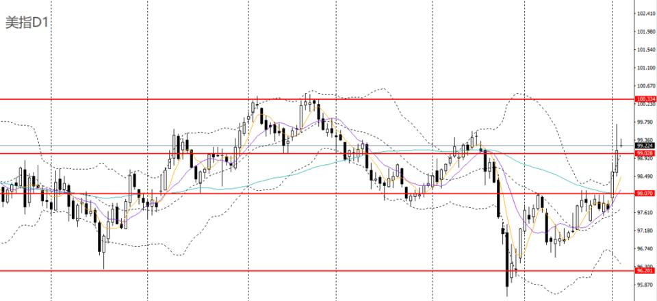 美元指数昨日冲高回落,升破日线布林上轨,走势极为强劲,如维稳于99上方,短线预计将进一步上探100关口。