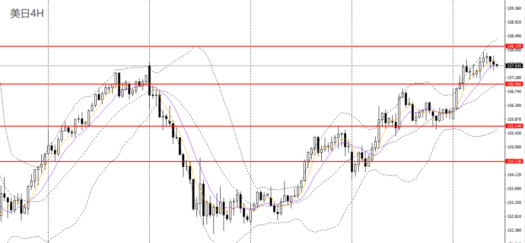 美日昨日小幅攀升,仍立于5日均线上方,4小时一度逼近158大关,短线走势偏强,但高位谨慎追多,如于157附近企稳可进多。