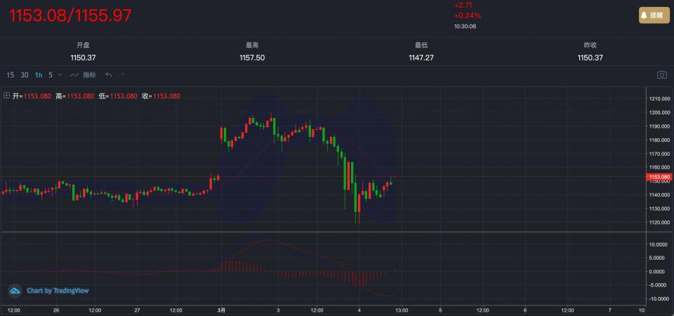从1小时图看,近期经历剧烈波动:3月初前大幅回落至1140-1150区间(形成明显低点),随后快速反弹,突破1150关口,目前站稳上方。K线呈小阳线,短期均线向上金叉,MACD柱状线从负值区收窄并翻红,显示空头动能减弱,多头开始占优。