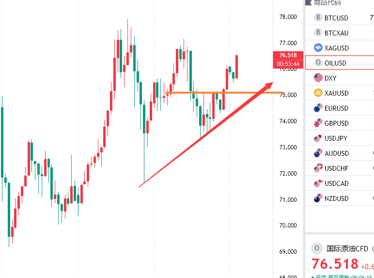 原油回踩75附近多,防守73.8,目标看77/78一线