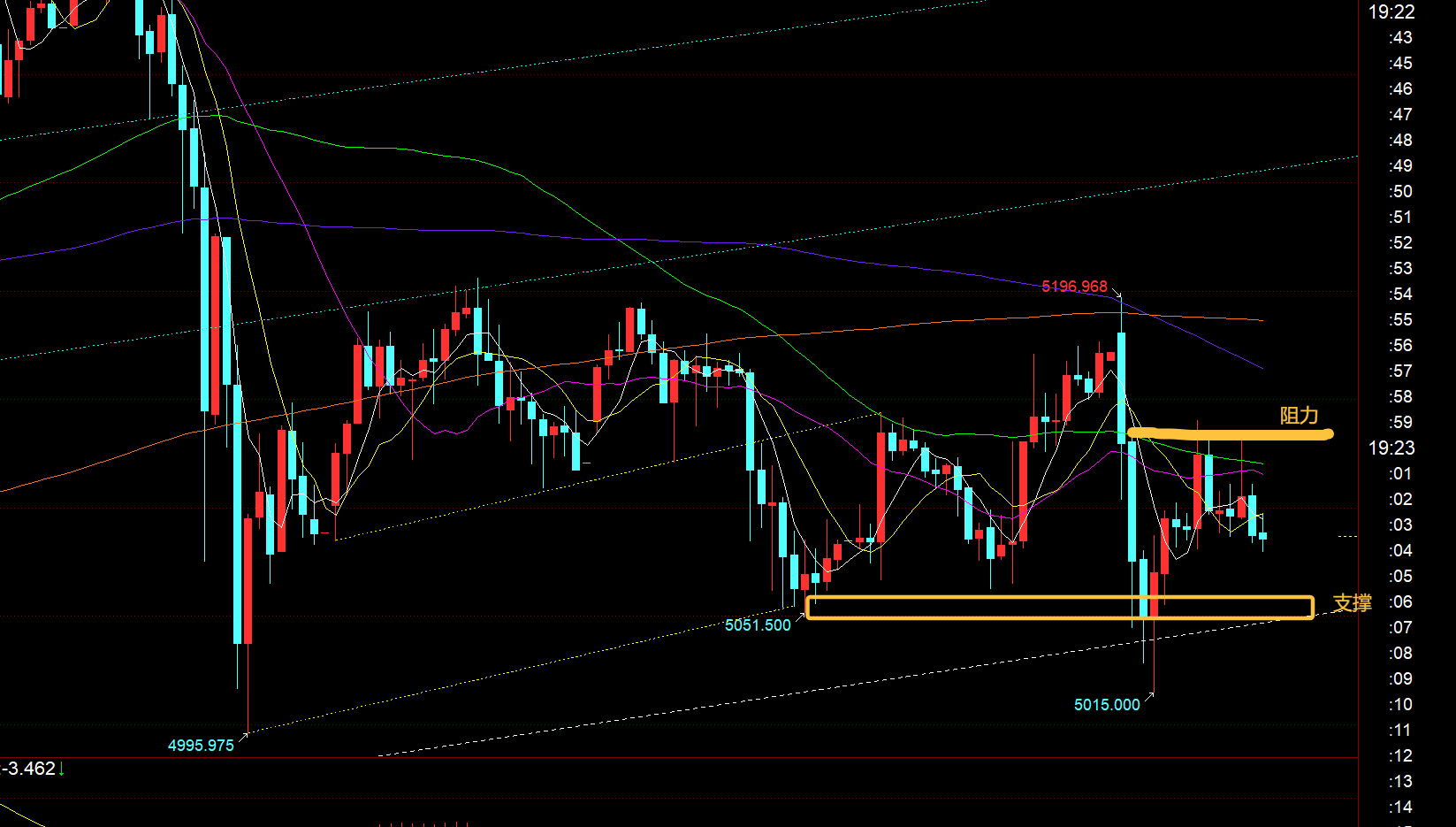 第二,黄金小时线级别:一早开盘的确先续涨了一波,靠近5200下出现冲高回落,本身那里提示只有阻力的,回落一下子击穿了上周五低点,最低5015再出现探底拉升,而拉升又刺穿了日内618分割阻力5125-27,最高5140承压回落至5085;所以,针对短期的震荡方向,其实不难判断,基本都是正确的,但它在关键支撑或阻力触及后,时不时容易出现惯性上拉点或下穿点的动作,这就会导致短线的防守容易出现刺破扫盘;对于美盘来讲,首先亚盘下跌一波,欧盘仍处于一定压制整理,美盘大概率还会震荡,并且会有二次下探;其次,短周期macd基本早完成了下行动能,都已转为看涨的形态,处于酝酿之中,所以拉低是容易探底拉升的;那么,阻力还是618分割位置5125-27之下,支撑关注日内反弹的618位置5062,以及通道下轨支撑5050,若惯性击穿下行,只要收盘探底拉升长下影K回到通道之内,那么支撑依然是有效的;倾向于今晚探底拉升震荡。 (若小概率出现砸盘失守5000关口了,也不要慌,4870-80上具备较大买盘,下去了也预计昙花一现,很快会回升,敢出好的低位,就要敢于炒底)