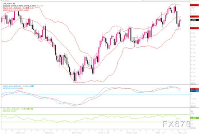 澳元周二(2月7日)波动很大,兑美元涨幅一度达到1.15%,至0.6959美元的日内高点。澳洲央行稍早升息25个基点,并重申将可能需要进一步升息--比许多人的预期更为鹰派。澳洲央行这种表态说明,其认为通胀将在较长一段时间内保持高位,打压了今年晚些时候或明年初放松货币政策的看法。4小时图上,澳元兑美元在0.6850附近得到较强的支撑,MACD出现金叉,显见短线或会产生较强的反弹。上方初步阻力在0.70,破位后有望向0.7100冲击。而下方若跌破0.6850,将威胁0.68至0.6725区域的支撑。