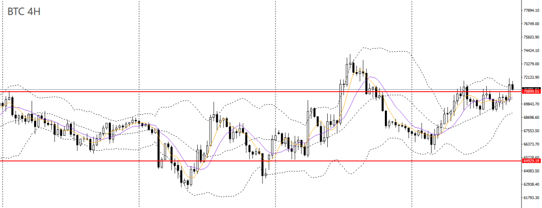 比特币昨日收十字小阴线,日线RSI位于50左右,4小时刺破70000关口阻力,多头动能仍显不足,后市预计将维持震荡格局。