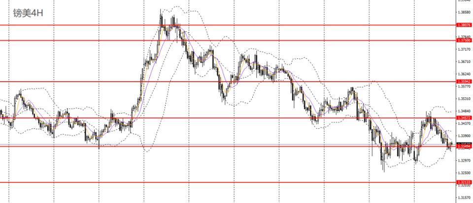 镑美昨日深度下挫,承压于5日、10日均线,4小时回踩1.3350附近支撑,如进一步下破,后市可看空至1.3280-1.33。