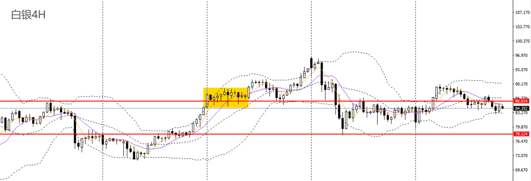 白银昨日延续回落,5日、10日均线仍交错粘合,4小时再度承压于86一线,86附近不破可进空。