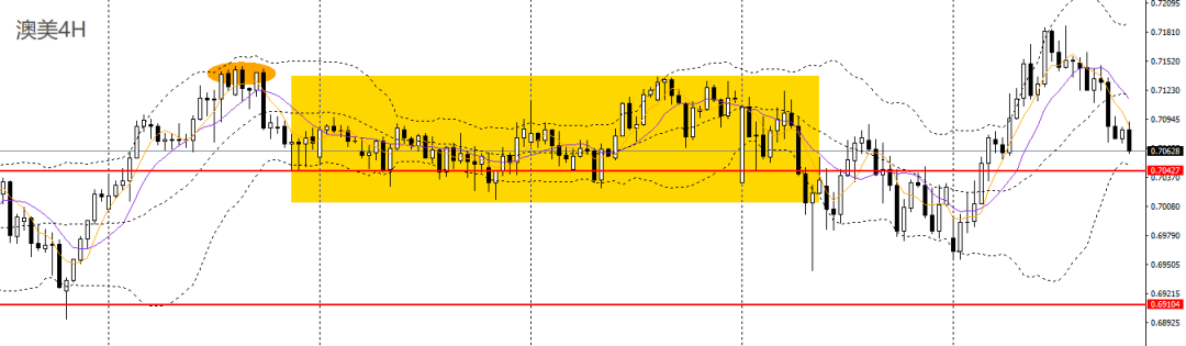 澳美大幅受挫,刺破5日均线,4小时呈头肩顶,失守0.71大关,回归此前震荡格局,如于0.71附近承压可进空,后市预计将回踩0.7040附近。