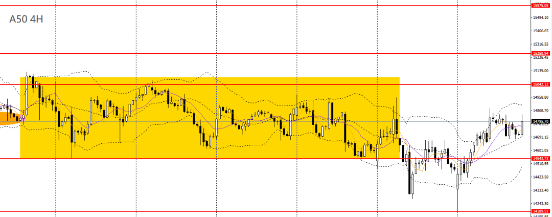 A50昨日阴跌,回踩5日均线附近企稳,4小时多次上探14800附近阻力,短线趋势再度转强,14600上方仍以看多为主,如站上14800,后市可继续上看至15000。
