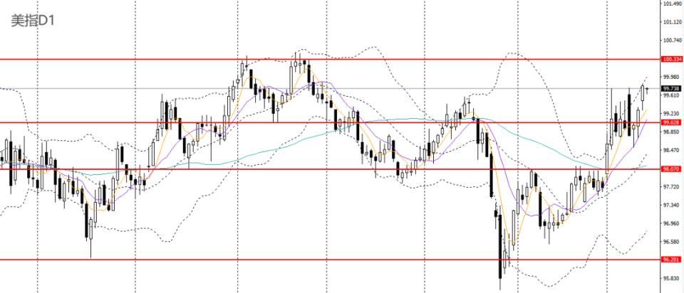 美元指数连日拉升,触及日线布林上轨,4小时升破99.70一线平台压力,上行空间打开,短线有望继续冲击100大关。