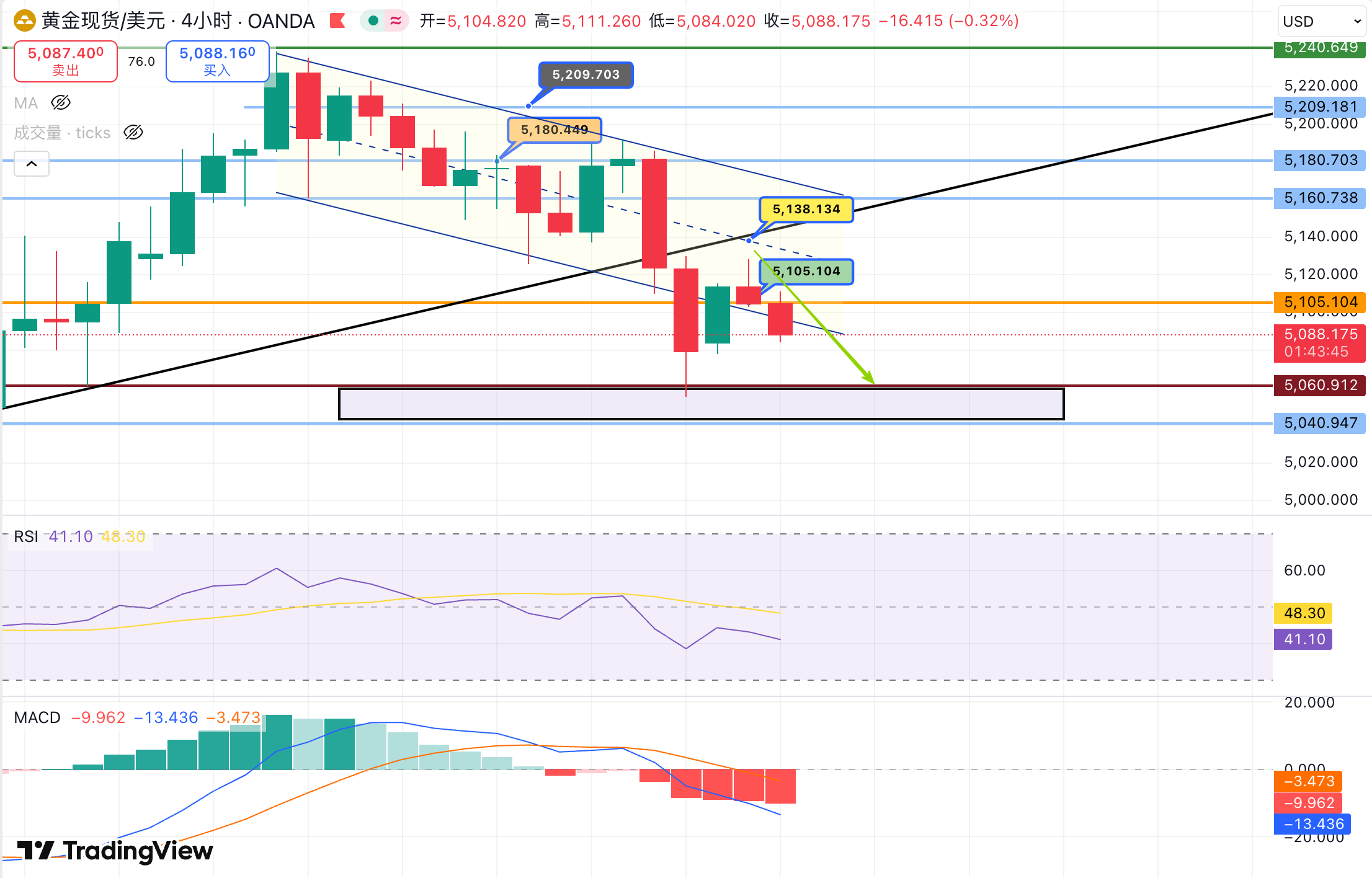 从技术面来看,黄金短线反弹动能有所减弱。若在 美盘时段金价持续运行在5100美元下方,则行情很可能再次转弱。与此同时,4小时级别MACD已经完全跌破零轴,表明中短期趋势仍偏空,市场仍处于调整周期之中。