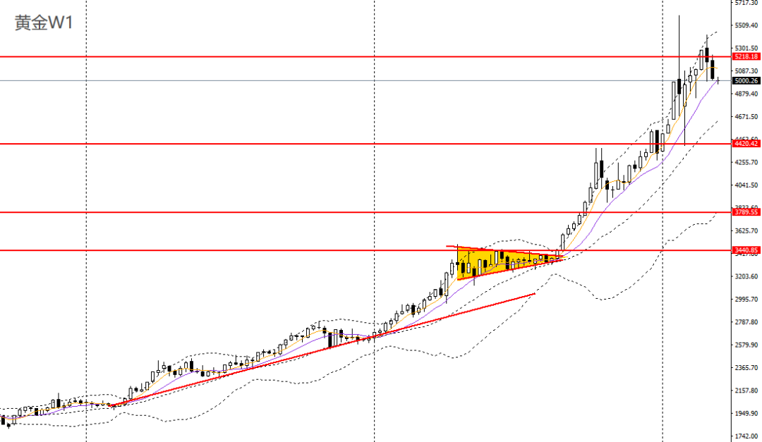 美原油上周收十字星,仍立于周线布林上轨之上,波段有望延续强劲走势。周五延续走高,日线RSI仍位于超买区,4小时刺破100关口,短线走势强劲,多单仍可持有,后市可继续看多至104附近。