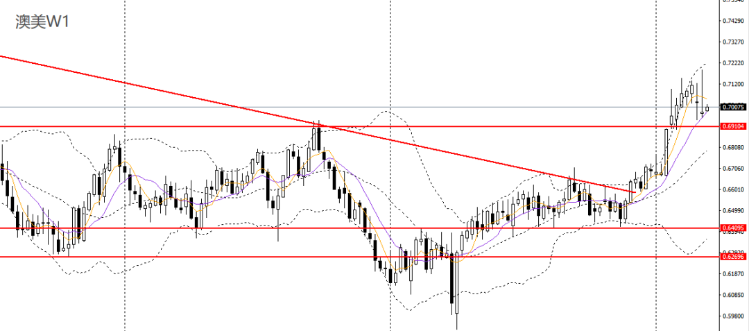 澳美上周收十字阳线,下探10周均线,波段整体趋势仍强劲。周五继续深度下挫,回踩日线布林下轨,4小时一度刺破0.70关口,整体仍处于区间震荡格局,如无法有效下破0.70,空单可暂时离场。