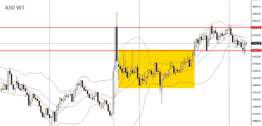 A50上周收看涨吞没阳柱,5周、10周均线呈空头排列,RSI位于50左右,波段预计将延续震荡下行。周五收倒锤阳线,4小时上探14800-15000压力带,短线趋势转强,但如无法有效升破15000,多单建议离场。