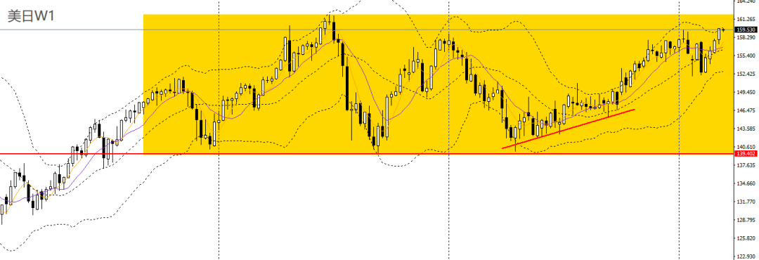 美日上周连续4周走高,RSI上扬,波段仍未摆脱高位震荡走势。日线连日走高,RSI到达高位,4小时反复回踩159关口企稳,多单可继续持有,短线大概率将进一步挑战159.80-160。