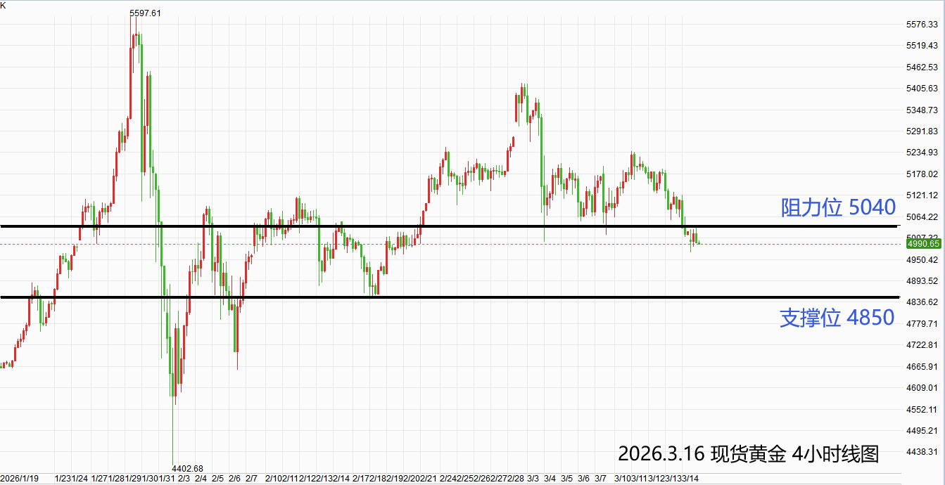 上周五黄金上冲下洗,逼近5000美元/盎司关口,日内亚盘与欧盘再次测试5000美元大关。截稿前,仍有下破疑虑。笔者认为,美伊战争日油价保持高位,使各国央行无法继续宽松,甚至市场预期部份市场将转驱紧缩,相对偏紧的货币政策利空黄金。市场依然高度聚焦霍尔木兹海峡能否正常通行,只要原油运输仍受阻,通胀预期都将保持高位,利空黄金。整体而言,短线建议投资者对于5000美元/盎司支撑力度保持保守态度,不要过度依赖其支撑,建议稳健者观望,激进者偏空操作。