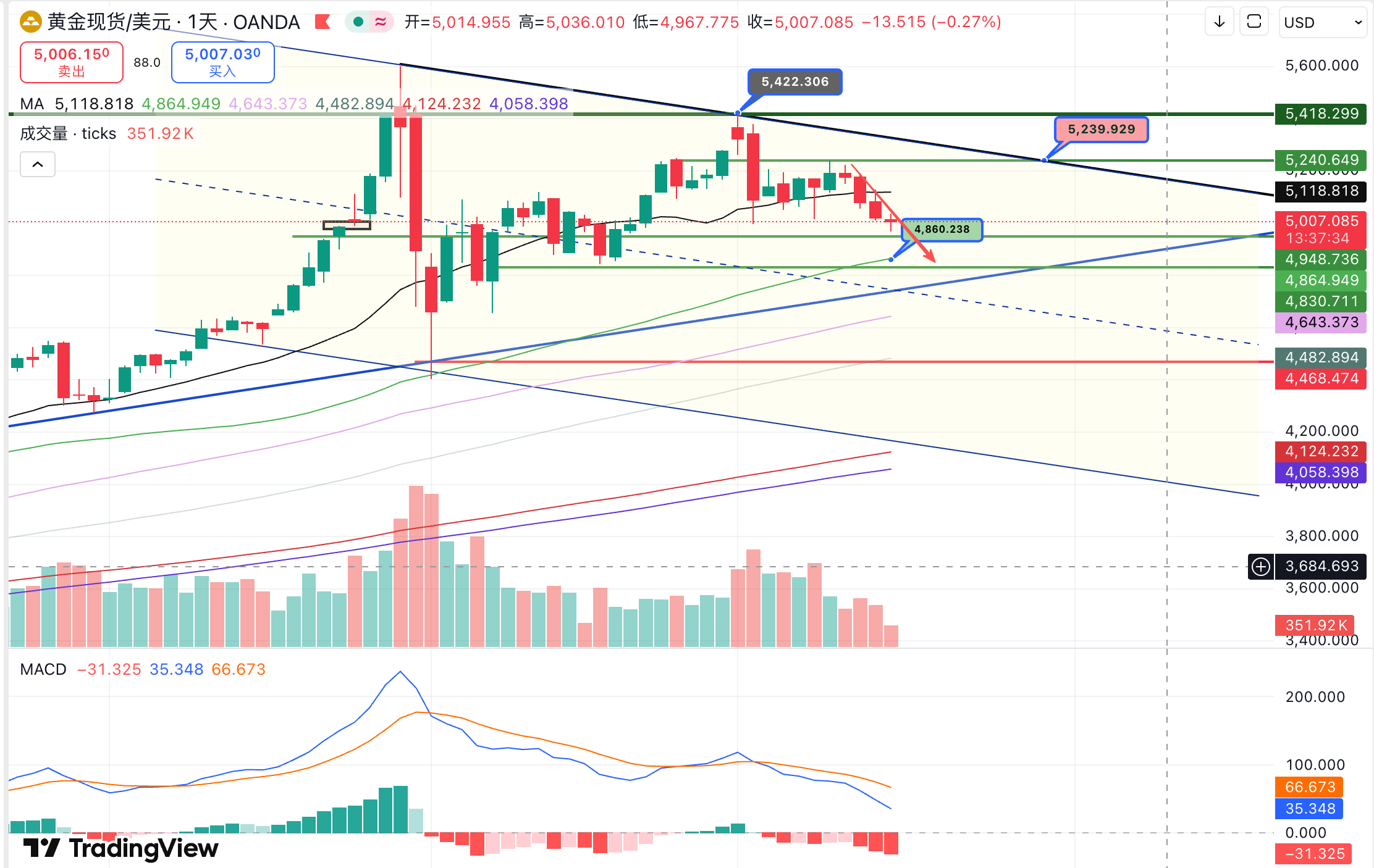 从 日线级别 来看,黄金由前期高点逐步形成的 下行趋势通道 已基本确立,目前价格主要在 5240—4949 区间内运行。