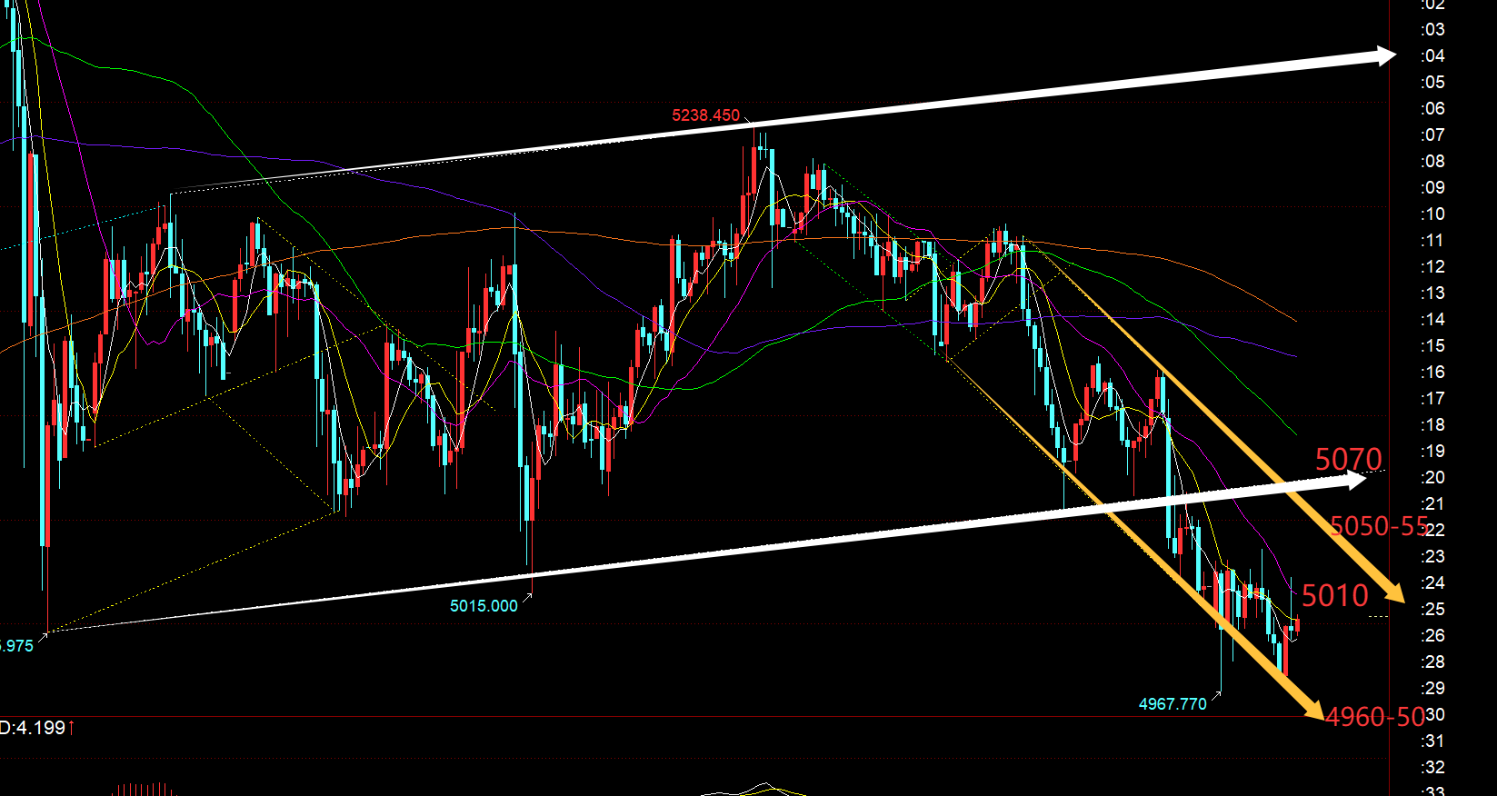 第一,黄金日线级别:上周四,周五连续阴线回测,收盘失守中轨,对于今日早间开盘5000位置就基本挡不住,会击穿,这也是周视频所提及的,但击穿空间预计是不大的,首要关键支撑是新通道下轨位置4950附近,早间惯性下跌最低是4967,差一些;今日来讲,就是关注日线收线的形态,能出现一根长下影K或反阳K,都会是短期企稳的迹象;