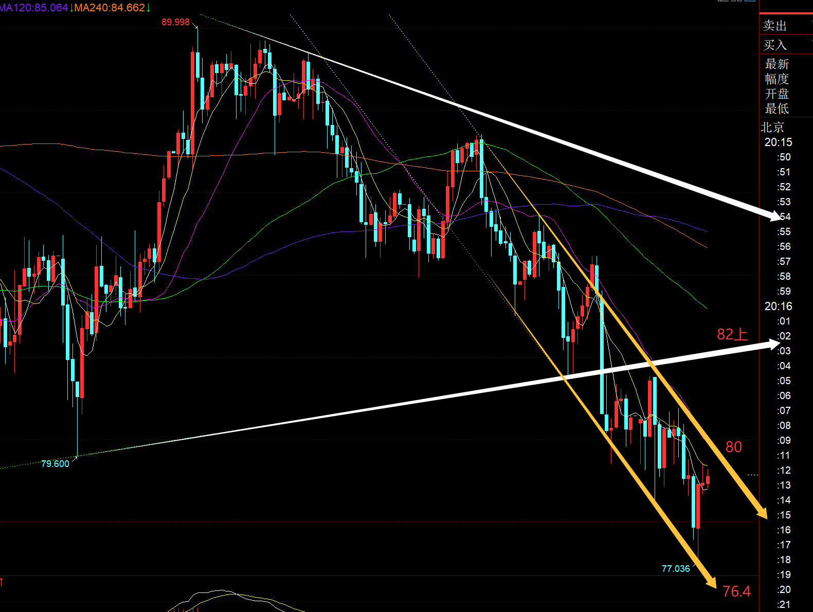 白银方面:从通道分布看,黄色下滑通道上轨下移80,也是小时线中轨,今晚重点关注它的得失,一旦突破站上,就会进一步反弹测试白色收敛三角下轨反压点82上,而站上它,则底部信号才能明确; 支撑77、76.4,拉低也是北上;