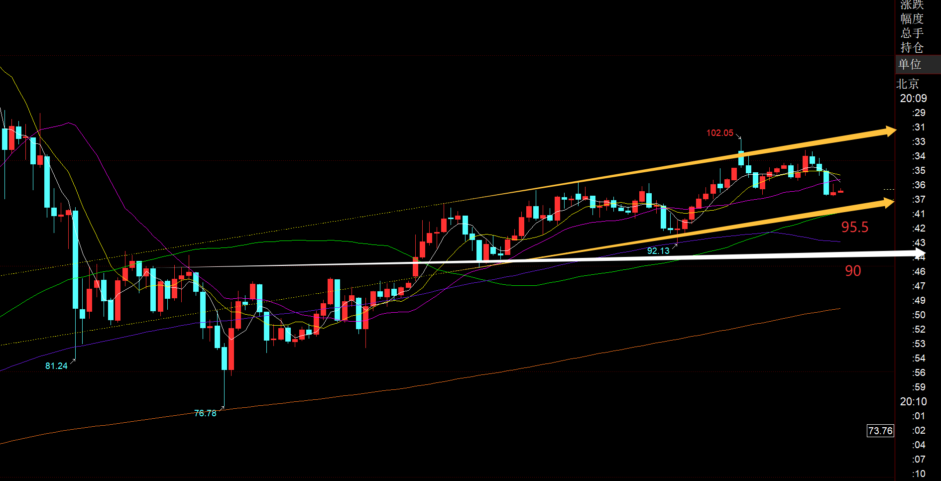 原油方面:周视频指出76.7-119.48的618分割阻力103.1附近存在关键承压,过不去则会出现一波有利的下滑;一旦霍尔木兹海峡得到缓解,油价下跌速度也会急速且力度很大,不排除指向71-67;今晚从通道分布看,留意95.5和90,陆续失守了,才能宣布这几日反弹的结束,再次会迎来狠狠的获利砸盘;