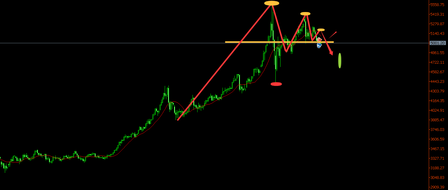 目前金价仍维持在5000点一线附近走震荡,从日线盘面来看,5000美元大关仍然是一个分界,上可攻下可守,今日下方的支撑为4970,上方的压力位,5050,今日操作思路仍然不变,亚盘可选择性的低多,而放空需晚盘之前再去考虑,看行情的变化,昨日晚盘我们实盘在金价支撑5000美元直接低多,收获了20美元。随后观望,今日早盘黄金再次出现横盘,仍然有探底的风险,操作上等待一波探底就可以低多接入,位置参考4990下手,要想放空,等到晚盘再行考虑。
