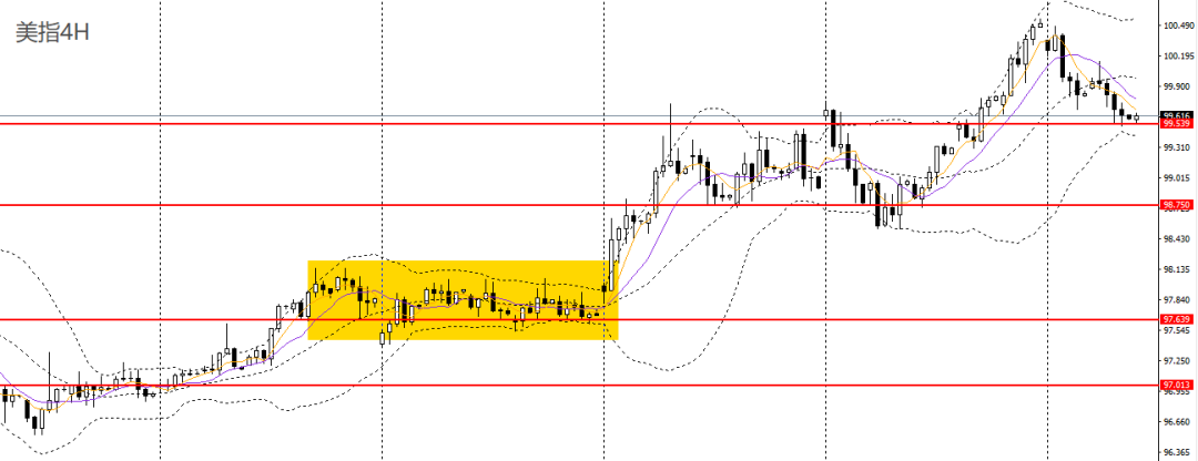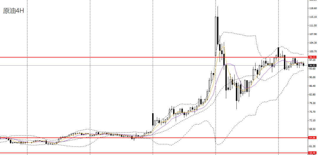 美原油昨日收流星阳线,4小时波幅收窄,98附近仍面临强压,短线大概率将维持高位震荡,可保持观望。
