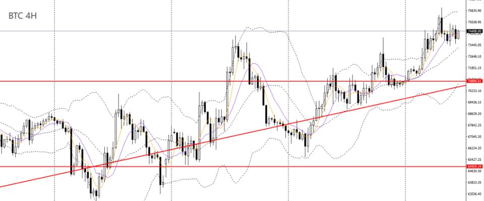 比特币昨日微幅反弹,日线RSI位于50之上,4小时仍徘徊于关键节点74000一线,短线趋势整体偏强,如维稳于74000上方,短线仍可看多至80000附近。