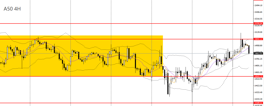 A50周二收流星阳线,4小时一度刺破15000关口压力,但未能有效升破,多单建议离场,稳健者可暂时观望。